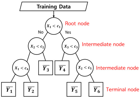 Schematic diagram of the regression tree. is an independent variable, and denotes an optimal splitting criterion value for the corresponding independent variables. The denotes the average value of the data belonging to the jth terminal node.