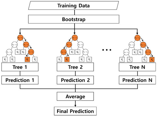 The RF was based on N RTs with N bootstrap samples (see Figure 3). The bootstrap samples were generated by sampling with replacement. Each RT was grown with the splitting rules using the different independent variables selected randomly. The final prediction was given by the average of the predictions from all RTs. In the RF, the importance of independent variables was measured through the increase of the node purity. The independent variable with the highest increase of node purity played a major role in the prediction.