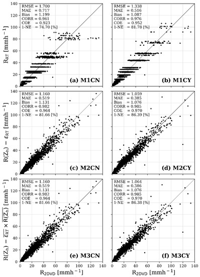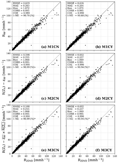 Figure 7 presents the results of the 10-fold cross-validation of RF. Overall, RF-based models show improved accuracy compared to the RT-based models in Figure 6. In M1CN (Figure 7a), the CORR value and the COE value are higher than 0.98, even though it presented the worst statistics among the RF models. Compared to M1CN, the underestimation in the strong R2DVD (R2DVD > 80 mm h−1) was corrected in M2CN and M3CN (Figure 7c,e), and the RMSE reduced by 4.93%. The RMSE, MAE, and bias decreased in M1CY (Figure 7b) compared with in M1CN, whereas the RMSE, MAE, and bias increased in M2CY and M3CY (Figure 7d,f).