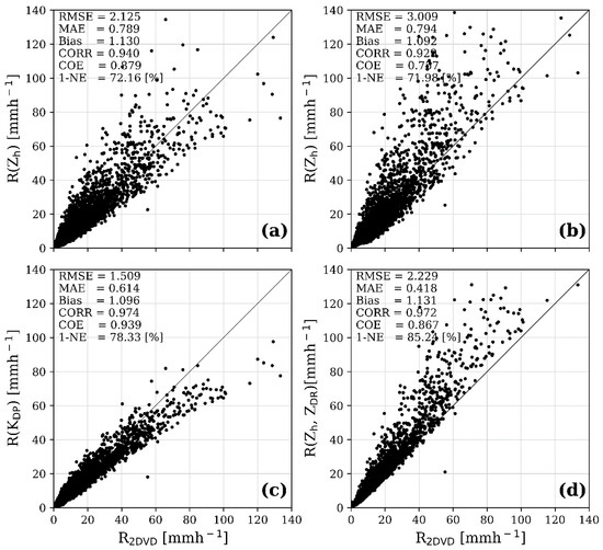 Estimation using KDP (Figure 8c) had the lowest RMSE value (1.509) and the highest CORR value (0.974) and COE value (0.939) among the estimations using empirical relationships; however, there was still underestimation overall. On the other hand, in the case of the relationship using Zh and ZDR (Figure 8d), the highest 1-NE value (85.24%) and the lowest MAE value (0.418) are presented, but most of the R2DVD values were overestimated. Among the ML models, the model that showed the lowest performance was M1CN-RT, with an RMSE value of 1.700 and CORR value of 0.961 (see Figure 6). This indicates that all ML-based models outperformed these empirical relationship-based approaches.