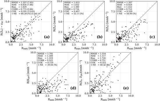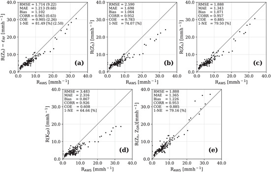 Scatter plots of (a) R(Zh)−, (b) R(Zh), (c) adjusted R(Zh), (d) R(KDP), and (e) R(Zh, ZDR) for Case 2 (11 September 2017). Values in parentheses (in (a)) represent the improvement percentage from the best performance of the empirical relationship.