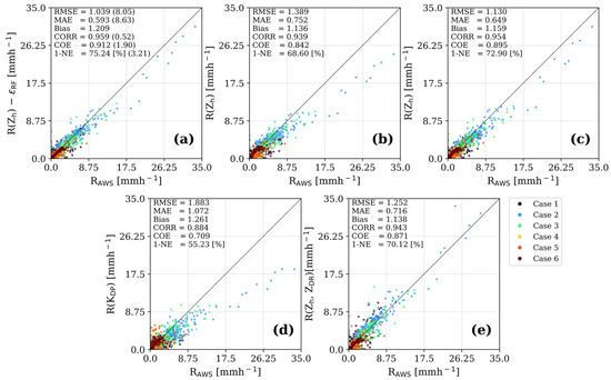 Scatter plots of (a) R(Zh)−, (b) R(Zh), (c) adjusted R(Zh), (d) R(KDP), and (e) R(Zh, ZDR), with different cases represented by different colors. Values in parentheses (in (a)) represent the improvement percentage from the best performance of the empirical relationship.