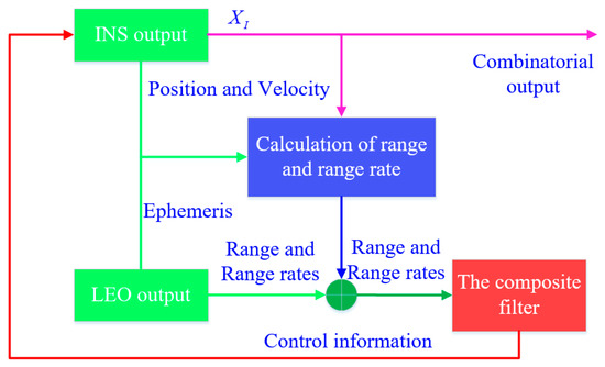 The flow chart of the INS+LEO 1 satellite integrated navigation algorithm without an altimeter, with an INS/LEO integrated navigation mode based on the range and range rates, is shown in Figure 4.
