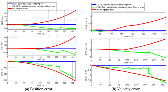 From the above analysis, we can find that, due to the inherent characteristics of system error, such as the pseudorange measurement noise and pseudorange rate measurement noise of the LEO constellation and the MEO constellation, the position error of the MEO constellation in a certain direction may be slightly lower than the position error of the LEO constellation. However, due to the long period of time it takes for the MEO satellite to pass the zenith, the geometric accuracy characteristics cannot be updated quickly. Therefore, the MEO satellite is unable to overcome the divergence problem of INS. In comparison, the LEO constellation does not have such problems, so it is more suitable for the navigation and positioning requirements under the integration of communication and navigation, and the LEO constellation can effectively improve the accuracy of navigation and positioning without much cost.