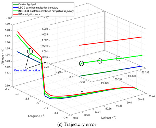To compare the navigation and positioning performance of LEO and MEO constellations, we compared and analyzed the navigation and positioning results in LEO and MEO scenarios under the condition of reasonable setting parameters, without a loss of generality. We focused on a comparison of LEO 1 satellite + altimeter and MEO 1 satellite + altimeter integrated navigation and positioning. Figure 8 shows the navigation and positioning results of the LEO and MEO constellations.