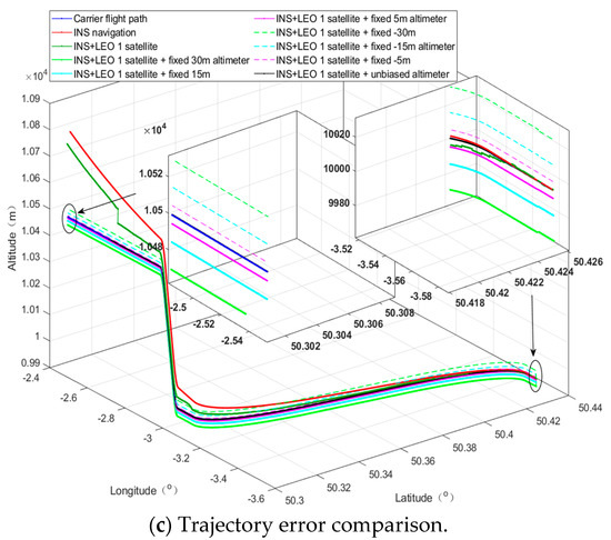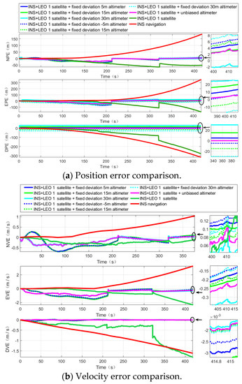To overcome the problem of the low positioning accuracy in the LEO 1 satellite + INS algorithm, we introduced an altimeter on the basis of the algorithm. In the altimeter scene, according to the altimeter deviation, we divided the altimeter scene into three types: The altimeter no deviation scene; the fixed deviation 30, 15, and 5 m scenes; and the fixed deviation −30, −15, and −5 m scenarios for comparative analysis. The simulation results are shown in Figure 7.