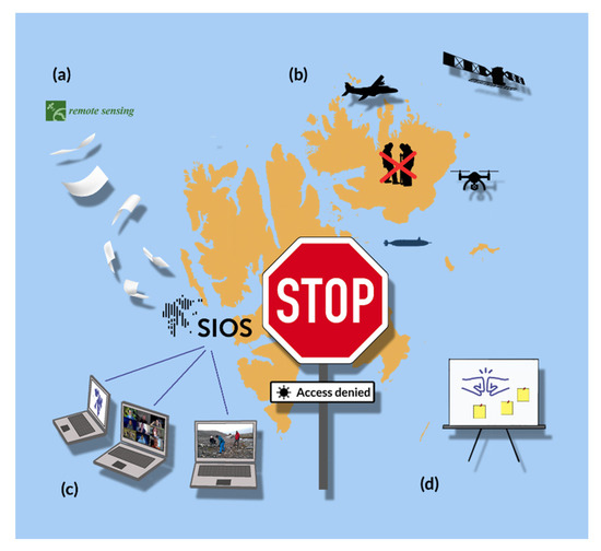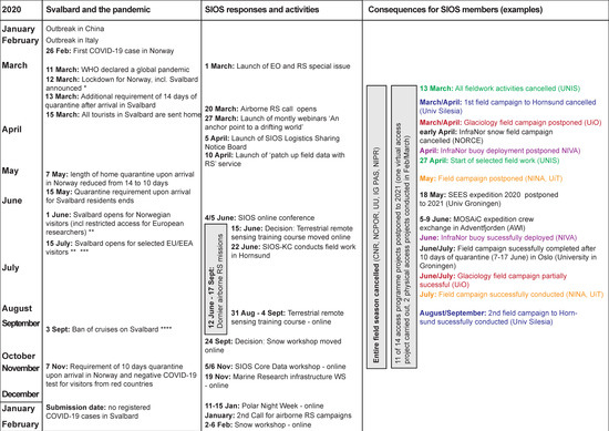 COVID-19 has posed a distinctive challenge to the scientific community working in Svalbard in terms of lockdown, remote working, cancelled social and networking events, cancelled fieldwork, changing working practices, and isolation and anxiety. Even though the pandemic has changed our regular activities for the unforeseeable time, the Svalbard research community continues in its resilience under the extraordinary and unparalleled current circumstances. In this study, we highlighted a bunch of EO, RS, and operational activities of SIOS and its member institutions to respond to COVID-19 related travel restrictions and resulting limited field activities in Svalbard. These activities were developed for the Svalbard research community, but we believe that similar activities can be expanded to the whole Arctic, Himalayas, or Antarctica or other remote places where field activities were affected during the COVID-19 situation. This set of activities will form a base for all such activities being implemented in other parts of the world and could significantly contribute to developing a long-term sustainable plan for responding to future similar situations. A few of these activities were developed for the new normal situation created by the pandemic, but we believe that these activities are transferable for the regular activities in future. Our efforts show that even after the lockdown of Svalbard due to the pandemic, scientific observations can be done using various means including EO, RS, and planning logistical activities using local skilled personnel. Laid off workers can be better utilised in conducting field campaigns in a future pandemic or similar situations. Times of crisis often result in innovation, new technology and new ways of working and thinking. Our experience and lessons learned during the pandemic would help to accelerate the development of remote sensing methods and solutions in order to reduce the environmental footprint of research in the fragile Arctic region. Our activities were successful in bringing the whole Svalbard science community together in pandemic times by facilitating collaboration via the SESS report, ACCESS programme, airborne measurements, webinars, online conference, training course, and finally documenting our response to COVID-19 in the form of a manuscript. The pandemic is not over yet, but these positive activities could stimulate more activities using EO and RS. Today, usage of satellites and other new technologies in RS such as UAVs, and aircraft-based data collection are more relevant than ever. It also gives the opportunity to carry out monitoring and research that minimises the environmental footprint of such activities in sensitive High Arctic ecosystems. It is not possible to observe all essential Svalbard variables (SIOS core data) using EO and RS, but we can secure a few of these variables when in situ measurement is not possible. This article attempts to share our experience, expertise, and activities for a broader audience in observing systems in Earth System Science. Overall, the results of these activities will be realised in the coming years when we move forward into a post-pandemic world. The pandemic situation is changing rapidly, and the relevance of this work would be realised at later stages. We have summarised all the activities at the time of writing this paper while we continue preparing for the next year. A more detailed analysis of the short term (next field season), mid-term (next 3 years), and long-term (7–10 years) effects of the pandemic on Svalbard research have not been analysed yet. We anticipate that our activities will provide a foundation to respond to future similar situations.