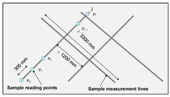 On the other hand, the F-numbers method [2,7] contains two ratings according to the ASTM E 1155 [7], which are floor flatness (FF) numbers and floor levelness (FL) numbers. The FF numbers measure the degree to which a surface approximates a plane, whereas the FL numbers depict the conformity of the floor surface to the intended slop indicated in the design documents. The FF numbers method is discussed in the following since it measures the degree of flatness for a surface. Figure 2 illustrates the calculation of FF numbers for surface flatness inspection [2]. First, sample measurement lines on the surface are created. Second, each sample measurement line is sampled into 300-mm long intervals, and the cut points are called “sample reading points”. Third, the elevations of the sample points of the sample measurement lines are calculated. Note that the elevation of the sample points is presented by the height (z coordinate) of each scan point collected on the test surface. Finally, the FF numbers, statistical numbers taking into account curvatures between all the sample points, are computed. Table 1 shows the flatness tolerances of concrete slabs specified in ACI 117 [2] for different flatness levels. Normally, a higher FF number indicates a flatter surface. For example, a floor classified as “very flat” has an FF number ranging from 35 to 45, while the FF number of a floor regarded as “Conventional” is smaller than 20. Compared to the straightedge method, the FF numbers method is advantageous in two aspects. First, the sample points are distributed throughout the whole surface as specified in the FF numbers method, thereby covering and reflecting the elevation deviations globally. In addition, the interval of 300 mm between two sample points is much smaller compared to that of the straightedge method, resulting in a more accurate surface flatness measurement. For these reasons, the FF numbers method is selected as the measurement of surface flatness in this study and the detailed steps are presented in Section 4.