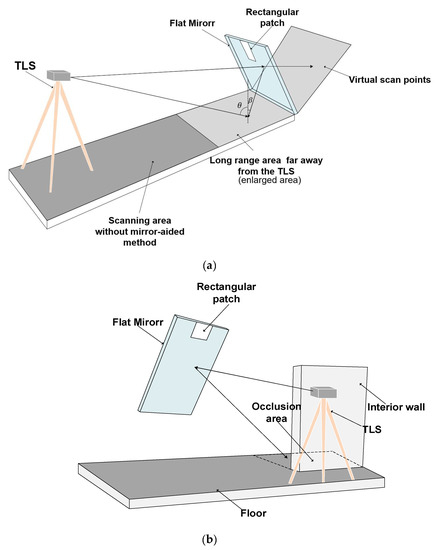 This study proposes two hypotheses to enlarge the scanning range, increase the measurement accuracy in the long-range area far away from the TLS, and enable flatness measurement in hidden areas, as illustrated in Figure 3. Figure 3a illustrates hypothesis 1. Here, the scanning area far away from the TLS with a light gray color has a large scanning distance and a high incident angle (θ), resulting in a relatively low flatness measurement performance. With the implementation of the mirror-aided method, the laser beam emitted from the TLS is first reflected by the mirror and then reaches the long-range scanning area, leading to a lower incident angle (β) and higher surface flatness inspection accuracy. Since the study targets the front area on the basis of the mirror, the occluded areas behind the mirror are not considered. In addition, only virtual scan points generated by the mirror are used in this study due to the existence of a high incident angle problem for actual (direct) scan points, although the area under the mirror is scanned twice. With the help of using mirrors, the areas far from the TLS can be scanned with high accuracy, indicating that the proposed method can enlarge the scan range. Note that the long rang area (marked as light gray color) is regarded as the enlarged area.