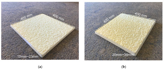 Two experiments, named “experiment I” and “experiment II,” were conducted to validate the two hypotheses. The specific objectives of the experiments are to investigate: (1) the capability of the proposed mirror-aided approach to increase the surface flatness inspection accuracy at the areas far from the TLS and (2) the possibility of scanning occluded areas with an acceptable measurement accuracy with the existence of physical barriers for surface flatness inspection. Here, since there is no need to scan a large area of the surface for validating the accuracy at the far-field area, two lab-scale specimens were used in this study. Figure 4 shows the two specimens, named “specimen I” and “specimen II,” which are classified under the “conventional” flatness type. Table 2 illustrates the dimensions and FF numbers of the specimens. The specimens were manufactured by a 3D printer, ZRAPID iSLA880 [25], with the material of photopolymer resin. While specimen I has the dimensions of 400 mm (length) × 400 mm (width) × 10–23 mm (height) with the FF number of 10.28, specimen II has the dimensions of 400 mm × 400 mm× 20–38 mm with the FF number of 21.23. Note that according to ACI 117 [2], specimen II is designed to be flatter than specimen I.