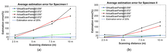 FF number estimation errors under various angular resolutions and scanning distances: (a) average estimation error for specimen I and (b) average estimation error for specimen II.