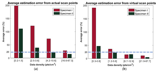 Estimation errors of FF numbers with varying scan densities in specimen I and II: (a) average estimation error from actual scan points and (b) average estimation error from virtual scan points.