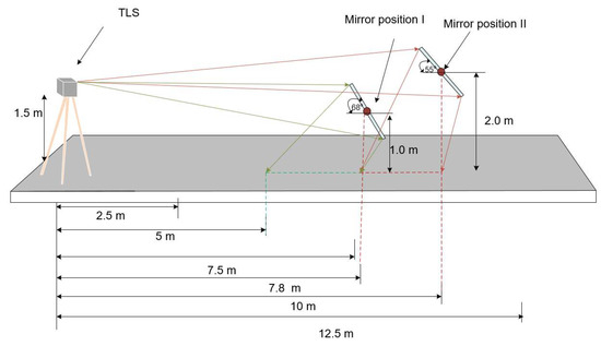 Figure 6 shows the test configuration of experiment II. The TLS was set with a height of 2.5 m with respect to the ground and was located with a distance of 1.8 m and 1.2 m to the mirror and the specimen, respectively. Moreover, barriers were erected between the TLS and the specimen to create an environment that ensured that the specimen was invisible from the TLS. In addition, a mirror with the size of 1000 mm × 1000 mm was located with a distance of 0.2 m behind the specimen. The mirror on the bottom line is set parallel to the specimen, positioned with a vertical angle of 70° with respect to the ground. As with experiment I, two rectangular patches of 100 mm × 100 mm in size were attached to the upper-side region of the mirrors for mirror plane estimation, and two angular resolutions of 0.036° and 0.072° were used for the tests.