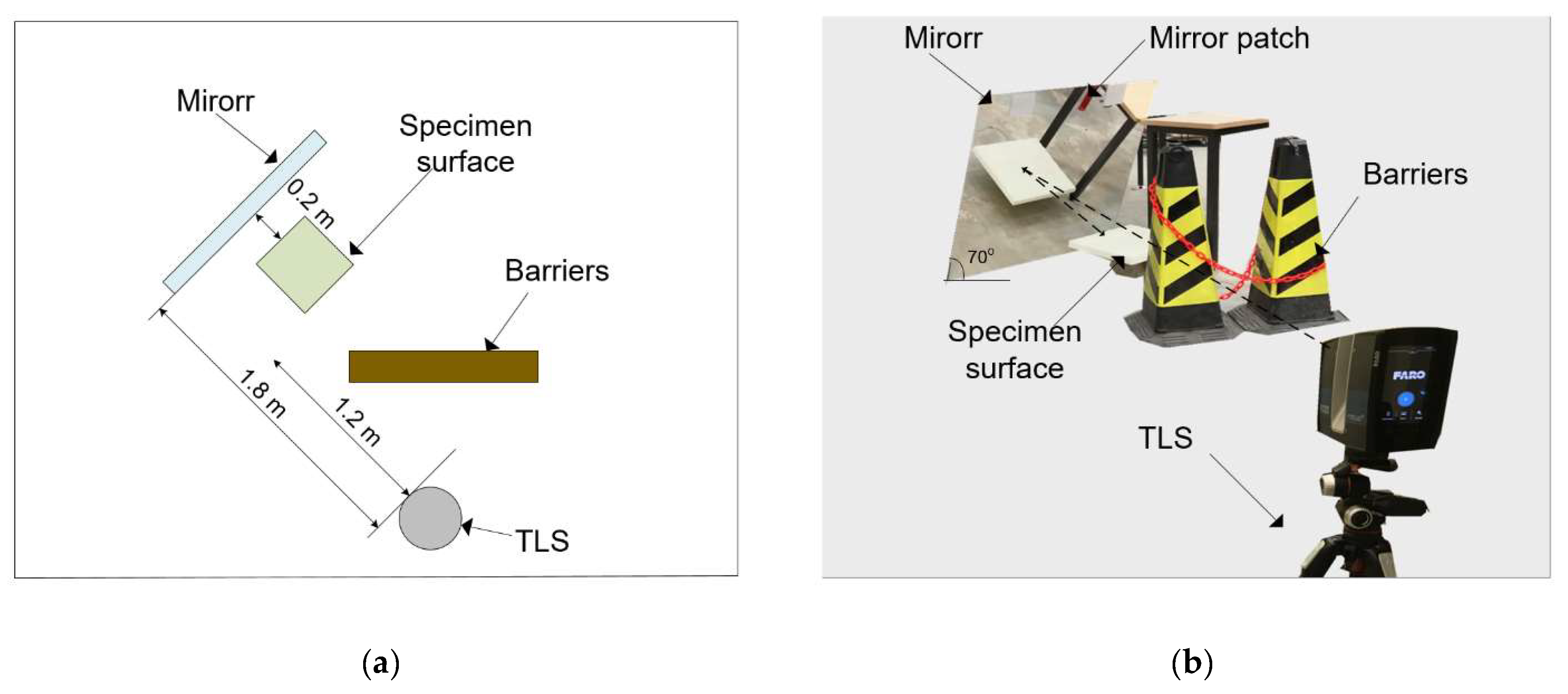 - Li, D.; Liu, J.; Feng, L.; Zhou, Y.; Liu, P.; Chen, Y.F. Terrestrial laser scanning assisted flatness quality assessment for two different types of concrete surfaces. Measurement 2020, 154, 107436. [Google Scholar] [CrossRef]