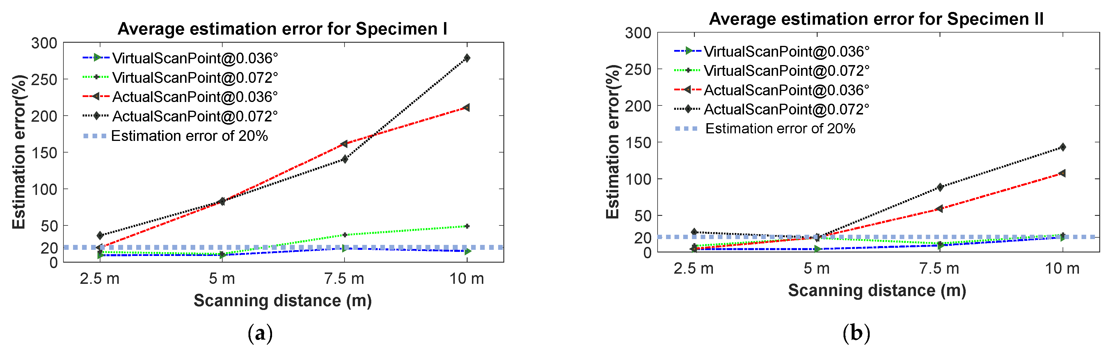 | Object | Scanning Distance (Incident Angle) | Estimation Error of FF Numbers Specimen I in Percentage (Data Density: pts/cm2) | Estimation Error of FF Numbers Specimen II in Percentage (Data Density: pts/cm2) | ||