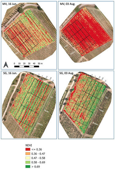 Moreover, the crop growth could have been mainly affected by soil water deficit at the veraison stage in August, which was reflected in a lower IR reflectance of chlorophylls that turned into lower plant vigor and thus lower NDVI values [16,18].