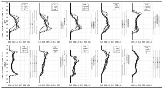 Referring the two UAV flights, Figure 5 and Figure 6 depict the distribution frequency of the NDVI pixels, which are referred to the central vine row of the treatment and for the three subplots (e.g., top, middle and bottom) localized along the slope gradient. The same Figures also show the boxplots that allow a quick encoding of the distribution frequency.