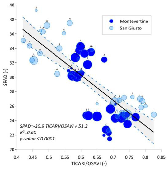 The SPAD measurements were plotted against the correspondent TCARI/OSAVI values acquired in both flights (Figure 8). Moreover, the graph includes gravel content, which is proportional to the size of the bubble. There was a negative linear correlation (R2 = 0.60) between the two variables. The values of TCARI/OSAVI were higher in June than in August for both farms, probably due to the mature condition of the leaf structure at the veraison stage. However, the relationship represents the TCARI/OSAVI patterns in time but not in space, which could be related to the limited number of measurements at leaf level that did not allow a good interpretation of the intra-field variability of the SPAD.