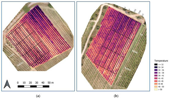 Surface temperature image referred to the entire experimental plots in (a) MV and (b) SG.