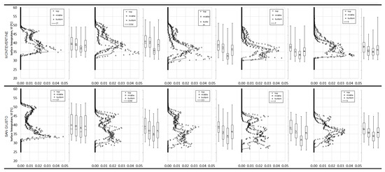 The median and quartiles of every distribution frequency in both farms follow the slope gradient. Hence, the bottom part had a lower temperature in all treatments in both farms, which is in line with [40], a study that highlighted vine water status dependent on the plot slope. As a consequence, there is a combined slope-soil properties effect which could affect the crop thermal status.