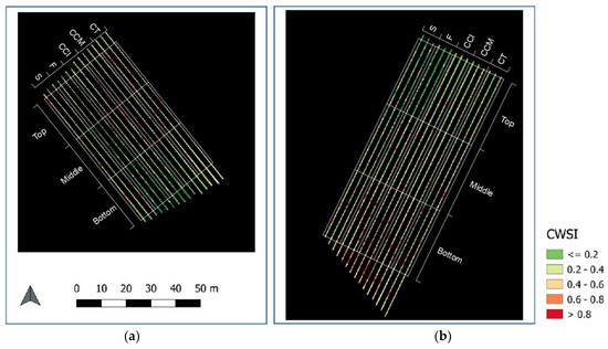 The CWSI spatial distribution displayed the same pattern as the surface temperature spectral images maps (Figure 11a,b). Therefore, the CWSI maps evidenced a gradient of the stress in SG from the less stressed area in the North-West to the most stressed area in the South-East part of the plot. On the other hand, in MV, the most stressed area was around the center of the field, and the less stressed ones were found at the top and bottom end of the map, confirming what was seen with the map of surface temperature.