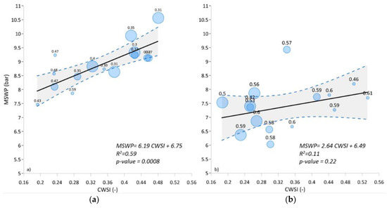 These relationships are confirmed by those reported in annual crops, fruit trees and grapevines, in which CWSI was the indicator that better reflected the crop water status and the root zone moisture content [20,24,39,47,48,58]. In addition, the correlation found between the effect of the slope gradient and the CWSI in MV was in line with previous findings, which confirmed that lower parts of the field slope present higher soil water contents [59].