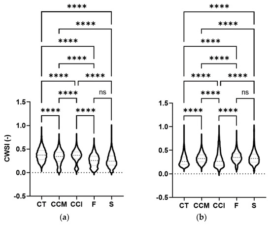 Maps of CWSI computed for (a) Montevertine and (b) San Giusto a Rentennano.