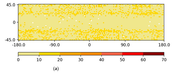 The data density of radio occultation soundings for (a) FORMOSAT-3 in March 2009 and (b) FORMOSAT-7 in March 2020. The data are counted on 2.5° by 2.5° bins.