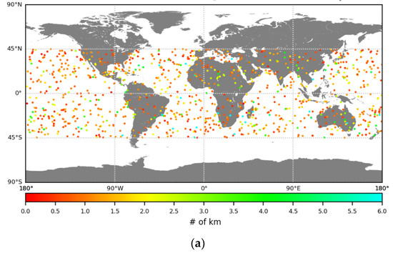 FS7 with a higher SNR is expected to increase the capability of the ray, reaching lower altitudes. As one example of the comparison on one day, Figure 2 shows the FS3 data on 5 February 2009 and FS7 on 5 February 2020, with their lowest penetrative heights indicated. There are 1018 RO soundings from FS3 and 5419 RO soundings from FS7 in the region of ±45° latitudes. Every dot point in Figure 2 indicates one RO sounding, and the color indicates the lowest height for each sounding. Note that all of the altitudes for the penetration in the figure were measured above the surface. Figure 2 illustrates that most of the FS7 RO data extend deeper into the lower troposphere than FS3. For example, the penetrative depths of FS7 data are below 1 km (Figure 2b), compared to about 1–2 km for the FS3 data (Figure 2a). The distribution of penetrative depths can be clearly seen from the 6-month statistical histogram (Figure 3). The data were collected from October 2008 to March 2009, with 209,709 RO profiles for FS3, and from October 2019 to March 2020, with 599,676 RO profiles for FS7. The data amounts for FS7 are about three times than that for FS3. All the lowest heights were stratified by a 500-m interval until 6 km, and the penetrative depth above 6 km was counted at heights of 5.5–6 km intervals. Figure 3 shows that the penetrative depths of RO soundings for FS3 mostly reach 0.5–1.5 km height, while FS7 gives the highest percentage in the altitude below 0.5 km. Statistically, the rate of penetration below 1 km is about 40% for FS3 and 80% for FS7. Similar statistical results are also found in [7,10].
