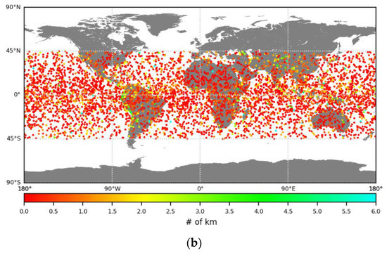 The radio occultation (RO) soundings within ±45° latitudes (a) for FORMOSAT-3 on 5 February 2009 and (b) for FORMOSAT-7 on 5 February 2020. The color indicates the lowest penetration height (km) of each RO sounding above the surface.