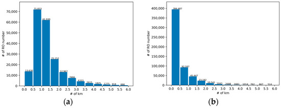 Data count of RO penetrative depth with a 500-m interval (a) for FORMOSAT-3 from October 2008 to March 2009 and (b) for FORMOSAT-7 from October 2019 to March 2020. All the heights are measured above the surface.
