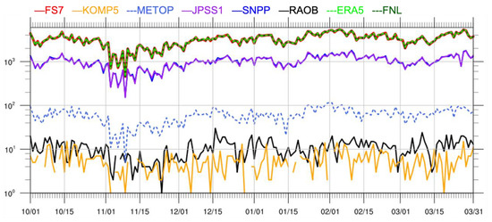 Daily data amounts during October 2019–March 2020 for FS7 (red), KOMP5 (orange), METOP (dash blue), JPSS1 (violet), SNPP (blue), RAOB (black), ERA5 (dash green), and FNL (dash dark green).