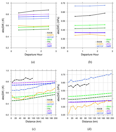 The mean absolute difference between FS7 and different datasets, including RAOB (black), KOMP5 (orange), METOP (light blue), ERA5 (green), FNL (dark green), JPSS1 (violet), and SNPP (blue), in (a) temperature (K) and (b) vapor pressure (hPa) versus the time (departure hours from the RO event) during October 2019–March 2020. The differences are averaged from surface to 200 hPa. (c,d) are as in (a,b), respectively, but versus the horizontal distance (in km) from the collocated RO point.