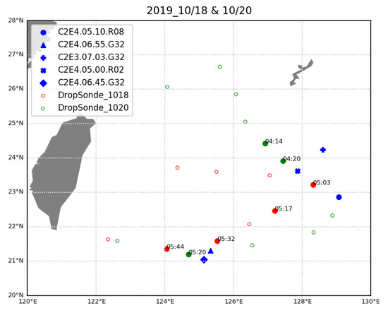 Locations of FS7 RO soundings (blue) and DROP on 18 (red) and 20 (green) October 2019. The red and green solid dots are the released DROP in the mission collocated with the five RO points, respectively, and the other DROP locations (open circles) were not used. The released time (UTC) of each collocated DROP is indicated by the numbers near the symbol.