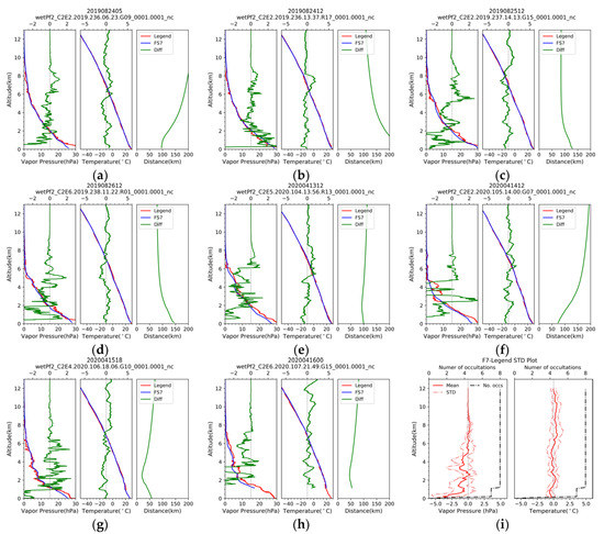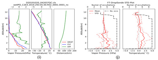 Figure 8 shows similar comparisons with the radiosonde soundings that were released at different times in 2019 and 2020 from the Research Vessel Legend. The route of the Legend vessel travels between Dongsha Island and Taiping Island in the SCSTIMX (South China Sea Two Island Monsoon Experiment). There were two trips southwest of Taiwan, one from 24 to 26 August 2019 and the other from 14 to 16 April 2020, to release the radiosondes for comparison with FS7 RO data. There were in total eight pairs selected for the collocated comparison indicated in the figure. The temperature differences of FS7 data were further reduced in these pairs compared to Figure 7, with an average of about 0.5 °C deviation and STD throughout the troposphere (Figure 9i). On the other hand, FS7 RO data give less moisture than radiosonde below 2 km in most pairs and a negative mean difference of about 1 hPa within the troposphere (Figure 9i). However, the negative mean difference extended to −4 hPa near the surface over this region, which is somewhat larger than the corresponding value found to the east of Taiwan (Figure 7j).