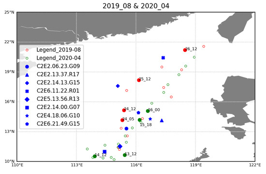 The same as that in Figure 6 but for the locations of FS7 RO soundings (blue) and RAOB released from the Research Vessel Legend on 24–26 August 2019 (red) and 14–16 April 2020 (green).