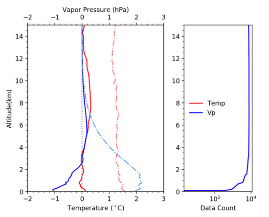 Besides the individual comparisons from the two chartered missions, the six-month data verification against RAOB was examined. The vertical distribution of the collocated data amounts of RAOB show no change between 2 km and 15 km and a quick decrease below about 2 km (Figure 10), and the volume gradually decreases above 16 km (figure not shown). In the troposphere, the six-month RAOB verifications show slightly positive differences in temperature and vapor pressure above 4 km but larger negative differences in vapor pressure in the lower troposphere. In the lower troposphere, RAOB has maximum deviations of about 1.5 °C and 2.2 hPa from the FS7 RO temperature and vapor pressure, respectively. A negative difference up to − hPa in the lower troposphere is present for RAOB, and the negative moisture deviation below 2 km is in agreement with the verification in [10], which may be associated with the tracking uncertainty due to the super-refraction from FS7 [7,9,10]. Generally, the absolute magnitudes of temperature and vapor pressure differences are less than 0.5 °C and 1 hPa, respectively, in the troposphere. The vertical average of the difference and STD from surface to 15 km altitude are 0.14 °C and 0.12 °C for temperature and are −0.03 hPa and 0.24 hPa for vapor pressure.