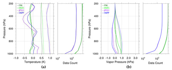Figure 12 shows the differences in the analyses between FS7 and other datasets, including ERA5, FNL, JPSS1, and SNPP. The amounts of data pairs for comparison are almost constant with height but are gradually reduced from 700 hPa to 1000 hPa. Compared to both FNL and ERA5, the temperature differences show negative differences for most of the profiles from surface to 200 hPa (Figure 12a). However, the comparison with satellite retrievals (JPSS1 and SNPP) show positive temperature differences below about 4 km (600 hPa) and larger negative differences relative to the global analyses above this height. The maximum temperature bias is about −0.6 K at about 450 hPa. The comparisons with global analyses exhibit smaller mean temperature differences and STDs, about half of those for both the satellite data. Even though FS7 RO analysis shows larger mean temperature differences and STD in comparison with satellite retrievals (Figure 12a), their absolute magnitudes are still comparable with those from other RO soundings or radiosondes, as shown in Figure 10 and Figure 11a. For vapor pressure (Figure 12b), both FNL and ERA5 show positive differences within 1 hPa near the surface. FNL gives a relatively smaller mean difference than ERA5, which might be associated with the fact that the NCEP short-term forecast is used as the model first gauss for the 1DVAR retrieval [25]. Thus, the verifications against FNL show the smallest STDs in both temperature and vapor pressure. In comparison with JPSS1 and SNPP in moisture, negative mean differences of about −0.5 hPa in 600–900 hPa are present in Figure 12b. The mean differences in both temperature and vapor pressure for both satellite retrievals are opposite to those for both global analyses below about 4 km (600 hPa) (Figure 12). As shown in Figure 5 and Figure 12, the JPSS1 and SNPP have similar patterns when compared to FS7, and the two datasets are combined together as NUCAPS for the later comparison.