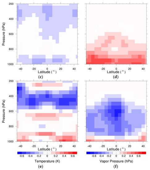 Pressure–latitude cross section of mean differences between FS7 and ERA5 averaged in a 10° by 10° bin in (a) temperature (K) and (b) vapor pressure (hPa). (c,d) are as in (a,b) but for FNL, respectively. (e,f) are as in (a,b), respectively, but for NUCAPS (JPSS1 and SNPP), respectively.