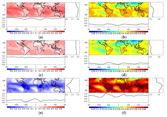 For vapor pressure, as shown in Figure 15, positive mean differences are produced when compared to both ERA5 and FNL, with somewhat larger magnitudes mainly in the lower latitudes for the former (Figure 15a). For FNL, the deviations are reduced below 0.2 hPa in the tropical region (Figure 15c) compared to those of ERA5 with 0.3 hPa (Figure 15a), which is also indicated by their zonal average. The water pressure differences for NUCAPS show significantly larger positive values with a minimum of −0.5 hPa, mainly near the equator (Figure 15e) in opposition to those of both global datasets. In terms of STD, ERA5 also gives larger deviations than FNL, but mainly over the southern hemisphere; both are much smaller than that for NUCAPS (Figure 15f). More consistency with both global analyses tend to suggest that some biases may be associated with NUCAPS retrievals, and FS7 retrievals may provide a reference to the bias correction for NUCAPS. In this study, only overall salient differences in the comparisons with three datasets are focused and without further detailing irregular variations with latitude or longitude.