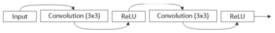The U-Net model was developed by Ronneberger et al. for biomedical image segmentation [44]. The U-Net architecture contains three sections: encoder, bottleneck, and decoder. The innovative idea in U-Net is that there are a large number of feature channels in the decoder section, which allow the network to propagate context information to higher resolution layers. A plain neural unit as used in U-Net is shown in Figure 1.