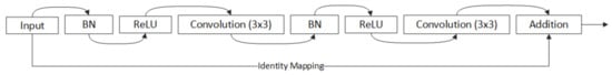 where , are the input and output of the residual unit, is the residual function, is the activation function and is an identity mapping function. In ResNet, multiple combinations of Batch Normalization (BN), ReLU activation, and convolutional layers exist. ResU-Net combines the strengths of both deep residual learning and the U-Net architecture [44] to improve performance over the default U-Net architecture [46]. Figure 2 shows the residual unit with identity mapping used in ResU-Net.
