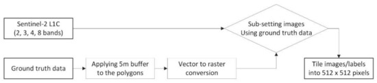 In our study, we used free-of-charge Sentinel-2 data. The Sentinel-2 constellation consists of two satellites (A and B), launched in June 2015 and March 2017, respectively. It is part of the Copernicus program by the European Commission in collaboration with the European Space Agency. Both satellites carry the MultiSpectral Imager (MSI) instrument with 13 spectral bands in total. Compared to other missions such as Landsat, Sentinel-2 offers several improvements. First, it adds spectral bands in the red-edge region that are particularly useful for vegetation applications, as well as a water vapor absorption band. Second, the spatial resolution of bands in the visible and near-infrared region is increased to 10 and 20 m. Third, the full mission specification of the twin satellites flying in the same orbit but phased at 180°, is designed to give a high revisit frequency of 5 days at the Equator. We have used bands 2, 3, 4, 8 of Sentinel-2 L1C data at 10 m resolution. The product is top of atmosphere reflectance, orthorectified, co-registered. Sentinel-2 images were obtained for the year 2017. Training requires images with low cloud coverage for field boundaries to be identifiable. For each tile, the Sentinel-2 image with a cloud coverage percentage of less than 0.1% was used.