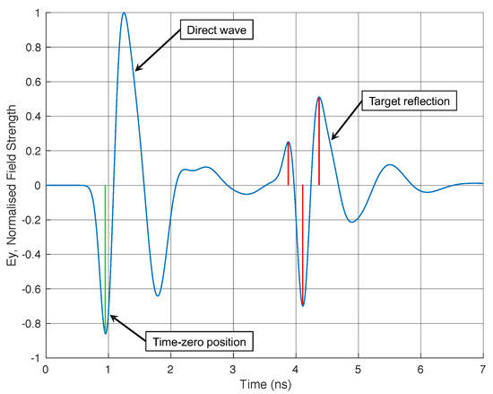 In Yelf’s paper [65], a number of positions have been discussed as possible candidates for picking the time-zero for a GPR trace, such as the positive peak, negative peak, mid-amplitude point, and the first break position of the direct wave wavelet. Additionally, for the arrival time of the target’s response, there are a number of possible positions that can be considered for calculating the two-way travel time. All of these cases have been considered and compared resulting in a better time-zero position. In this paper, the time-zero was positioned on the first peak of the direct wave and two way travel time was calculated from the time arrival average where the three reflected peaks of the target occur [66]. Figure 1 presents a GPR trace with a reflection from a PEC target. This time-zero picking methodology has been successfully evaluated using numerous numerical scenarios indicating the validity of the current approach.