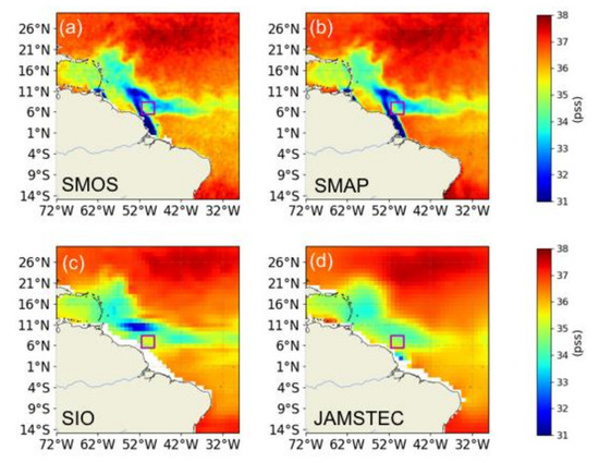 August 2015 monthly maps of (a) SMOS, (b) SMAP, (c) SIO, (d) JAMSTEC SSS near the Amazon mouth in the northwestern tropical Atlantic Ocean, 2–3 months after the peak discharge. The magenta square represents the box chosen to compute the SSS time series at the Amazon River mouth.