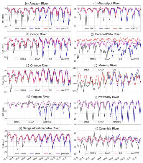 The research described in this paper was carried out at the Jet Propulsion Laboratory, California Institute of Technology, under a contract with NASA. Data for this paper are available at the following data centers we gratefully thank: the Ocean Salinity Expertise Center (CECOS) of the CNES-IFREMER Centre Aval de Traitement des Donnees SMOS (CATDS), at IFREMER, Plouzane (France) for SMOS SSS data (https://www.catds.fr/Products/Available-products-from-CEC-OS/CEC-Locean-L3-Debiased-v5) accessed on 15 December 2020; the Physical Oceanography Distributed Active Archive Center (PO.DAAC) for SMAP SSS data (https://podaac.jpl.nasa.gov/dataset/SMAP_JPL_L3_SSS_CAP_8DAY-RUNNINGMEAN_V4) accessed on 15 December 2020; the Scripps Institution of Oceanography (SIO) for the Argo salinity gridded product (http://www.argo.ucsd.edu/Gridded_fields.html) accessed on 15 December 2020; the Japan Agency for Marine-Earth Science and Technology (JAMSTEC) for the Argo salinity gridded product (https://pubargo.jamstec.go.jp/public/MOAA_GPV/Glb_PRS/OI/) accessed on 15 December 2020; the Research Data Archive at the National Center for Atmospheric Research (NCAR) for the river discharge data (https://rda.ucar.edu/datasets/ds551.0/#!description) accessed on 15 December 2020.