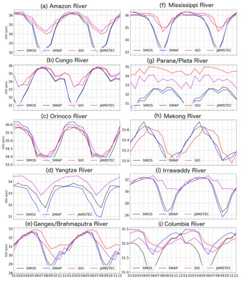 Furthermore, [24] showed that the magnitude and phase of seasonal SSS from in-situ gridded products (SIO and EN4, the version 4 of the Met Office Hadley Centre “EN” series of gridded data sets of global quality-controlled ocean salinity profiles) in major river plumes regions are subject to significant errors, and should not be used as benchmark to evaluate the assess the accuracies of the satellite SSS in these regions.