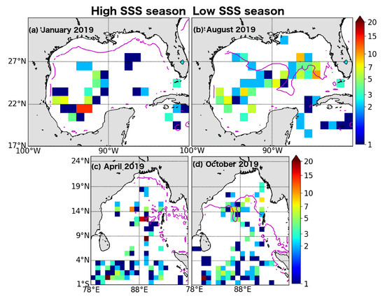 Number of 0–5 m deep in-situ salinity measurements within 1 × 1 degree bins over a month in the Gulf of Mexico (a,b) and Bay of Bengal (c,d) during the high SSS season (January and April 2019, respectively) and the low SSS season (August and October 2019, respectively). The plume contours (35 psu in the Gulf of Mexico and 32 psu in the Bay of Bengal, computed using monthly SMAP SSS data) are represented in magenta.