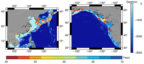 Monthly mean values of sea level time series from 107 tide gauge stations along North Pacific coast regions fulfilled the above criteria and are used in this study. Figure 1 shows the locations and record lengths of 107 tide gauge stations in the North Pacific Ocean. These tide gauges are classified into eight subregions (Table 1), namely the west coast of the South China Sea (SCSW), the East China Sea (ECS), the Sea of Japan (SJ), the northeast coasts of Japan (JNE), the southeast coasts of Japan (JSE), the Gulf of Alaska (GA), the west coast of Canada (WC), and the west coast of America (WA) (Figure 1).