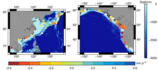 Estimated trends of mean annual amplitudes derived from tide gauges by EEMD in the Northwest (left panel) and Northeast (right panel) Pacific Ocean. Blank circle indicates the estimates of the trends that are not passing the significance test at 95% confidence level. The background was generated based on the global relief model ETOPO1 [26].